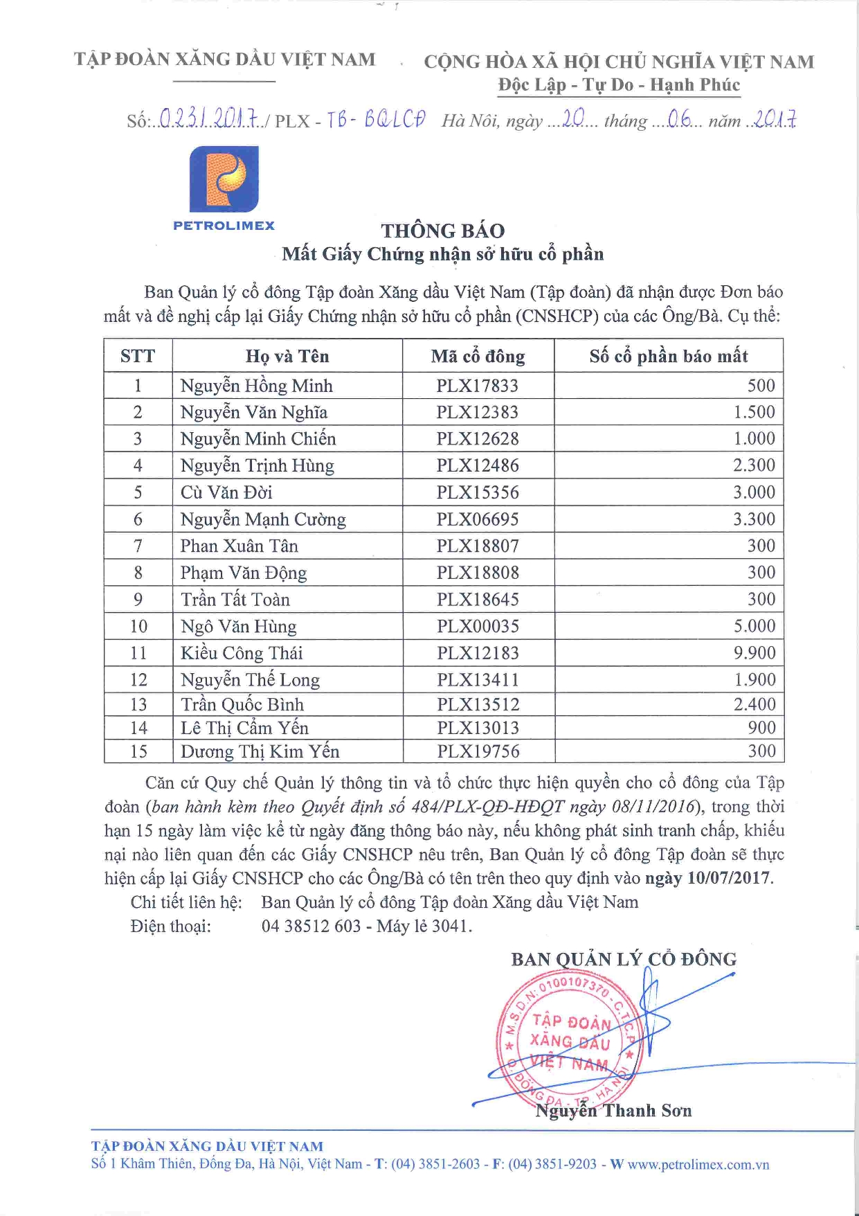Danh sách chi tiết tạiThông báosố 023/2017/PLX-TB-BQLCĐ ngày 20.6.2017và các mẫu Đơn đề nghị cấp lại GCNSHCP & Giấy đề nghị hiệu chỉnh thông tin - để Quý vị Cổ đông thuận tiện trong tra cứu, sử dụng.