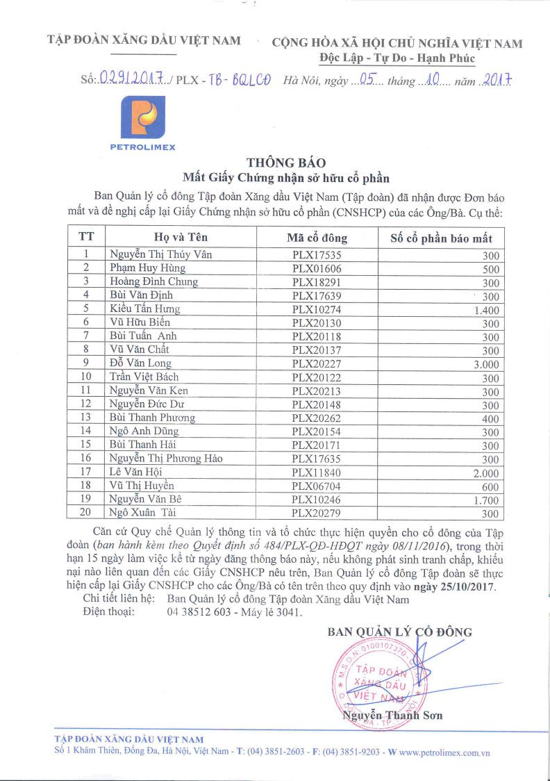 Danh sách chi tiết tạiThông báosố 029/2017/PLX-TB-BQLCĐ ngày 05.10.2017và các mẫu Đơn đề nghị cấp lại GCNSHCP & Giấy đề nghị hiệu chỉnh thông tin - để Quý vị Cổ đông thuận tiện trong tra cứu, sử dụng.